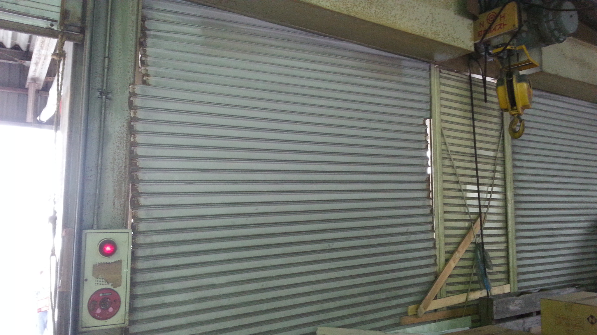 シャッター修理(電動シャッター)兵庫県尼崎市 倉庫電動シャッタースラットはみ出し修理